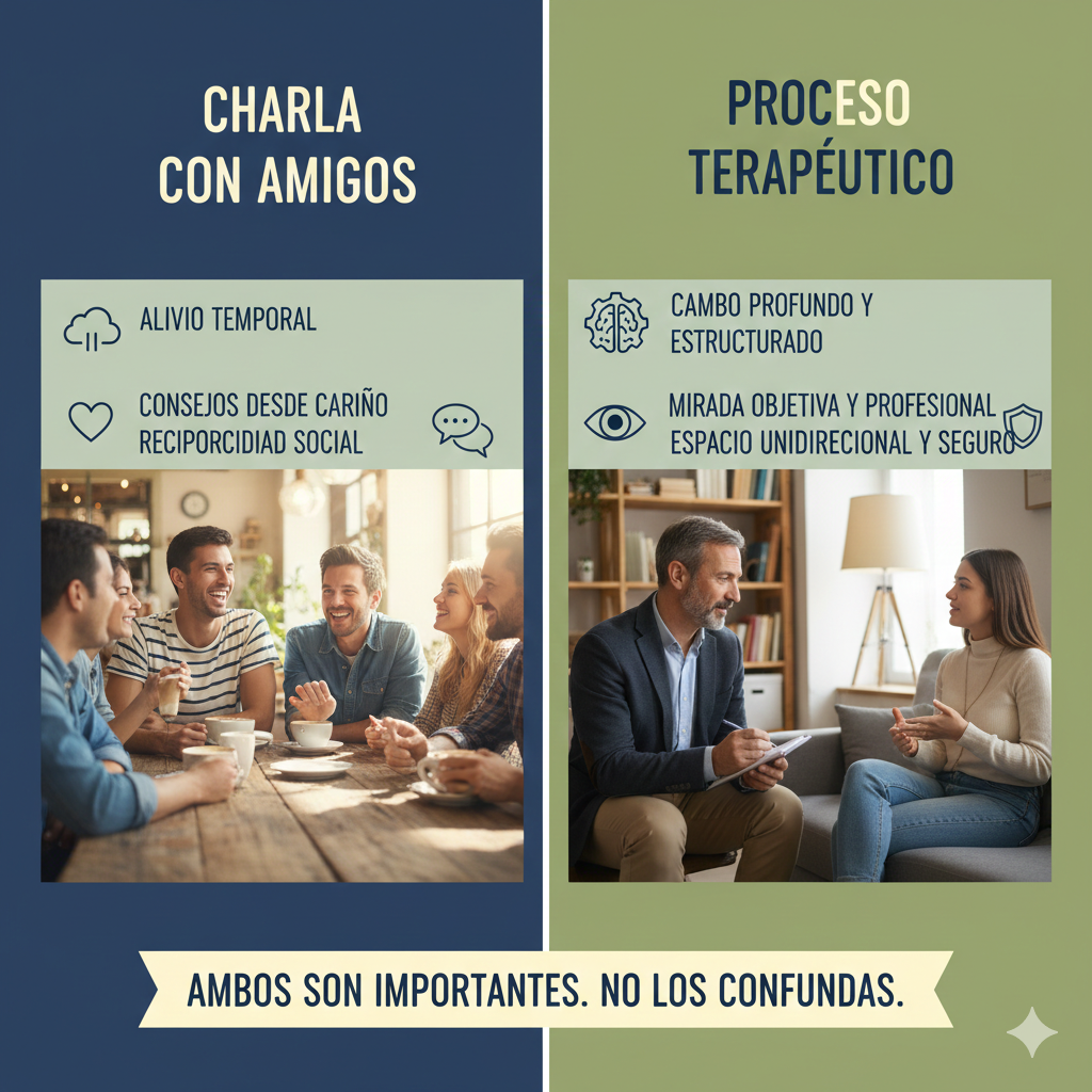 Confiar procesos complejos —como un trauma, una depresión clínica o una desregulación emocional severa— exclusivamente a los amigos puede ser contraproducente.
